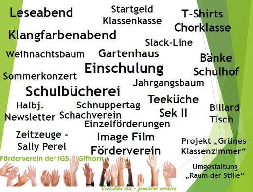 Der Förderverein der IGS Gifhorn, gegründet im Dezember 2014, versteht sich als eine Gemeinschaft, die vom Mitmachen, den Beiträgen und den Spenden lebt. Um im Sinne unserer Kinder flexibel handeln zu können, benötigt der Verein breiten Rückhalt der Elternschaft. Nur viele können viel erreichen. Wir wollen gemeinsam die schulische Bildung und den schulischen Alltag unserer Kinder unterstützen. Dafür treten Sie gern unserem Verein bei, indem Sie die Beitrittserklärung ausgefüllt in unsere Briefkästen an den "Infowaschmaschinen" in der Schule einwerfen (lassen).